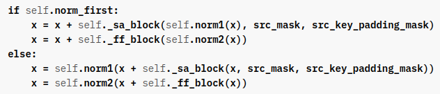 TransformerEncoderLayer类:基础的transformer (encoder) block(self-attention + FFN),初始化为(d_model, nhead, dim_feedforward=2048),即k,h,和FFN中hidden的中间的那个维度数量(毕竟最后是要回到k的)。