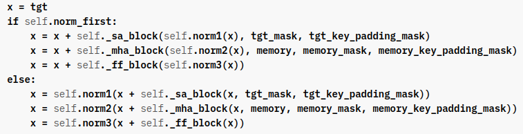 其中第一个self-attn的输入就是decoder这一边的输入,qkv和encoder一样是(x, x, x),第二个的输入是刚刚前面第一个的输出作为q,侧面来的外部的sequence作为k和v,即(x, memory, memory)