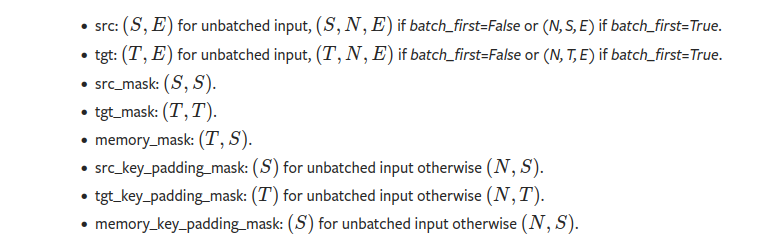 不难发现,transformer类在初始化时只需要保证后面的输入的特征维度是一致的,也就是这里的512,其他都是design choice,包括sequence的长度。这里甚至所有的参数都有默认值。而output的形状将随decoder自己的输入tgt保持一致
