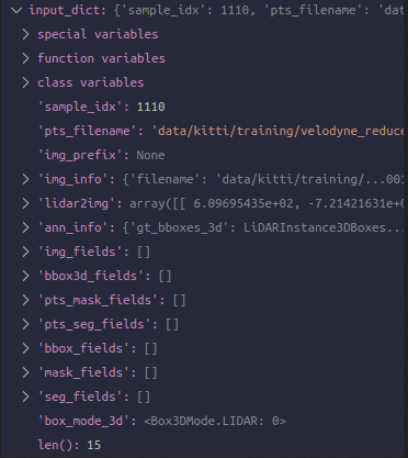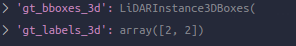 第三个:LoadAnnotations3D的call,很明显是加载我们的标签相关。根据传入的arg指定要加载的类型调用不同的类内加载函数,我们在这里是with_bbox_3d=True, with_label_3d=True。其实呢,在一开始加载data的时候这部分就蕴涵放在了前面的几个key里,这里是把它们提取了一下放在了新key里,毕竟方便用一些。得到如下两个key,label说的不过就是单单类别。另外,bbox_3d_fields这个list也有了gt_bboxes_3d这个字符串,于是可以猜测,带fields就是为了保存当前dict中有这个东西的key的名字都是什么,方便根据这个去找