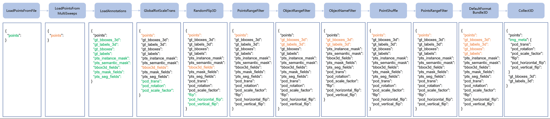第八个:ObjectRangeFilter,同样过滤一下bbox。经过这两步points和gt_bboxes_3d这两个key得到更新
