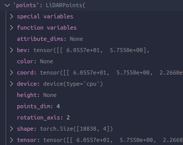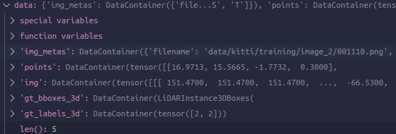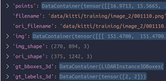 可以想象,前面我们对点云和bbox都用了mmdet3d两个不同的特色类,但是现在看来那个就是为了在pipeline中好操作的,现在马上就要结束准备,前面的transformation们也已经方便地做完,即将开始输入了。现在就把它们都回归正常tensor就可以了,所以对于这里,也就是mmcv对于tensor数据的包装DataContainer -