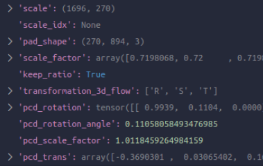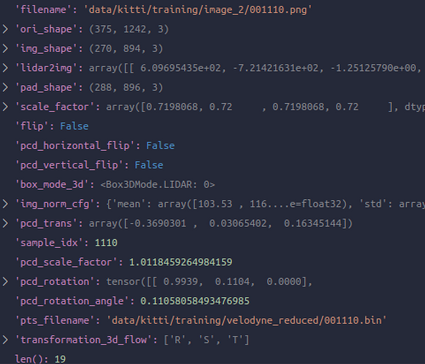第五个:GlobalRotScaleTrans,根据参数中给定的限制范围,这里对点云以及box进行augmentation操作:R/S/T,由于点云和bbox在mmdet3d中都已经是自己定义好的类别了,这里进行的操作其实是调用它们的类内函数如.rotate,.scale,.translate进行的。另外得到了如下keys