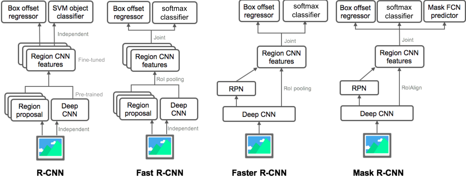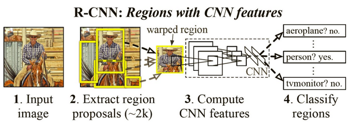 - R-CNN:selective search + warp + 类别和回归loss模式。就是使用selective search选出proposals(region proposals, region of interest, 总之就是表示我们预设的可能会出现object的有前途的region),然后warp它们为一个fixed的大小,输入cnn,得到feature vector,并行输到classification和bbox regression。我们label/groundtruth是在图片上的各bbox的位置大小和代表的类,与我们的region通过iou来界定。classification预测这个region对于各class的confidence/probability,如果足够bbox regression也有效,注意一个regression也是针对每个class的。