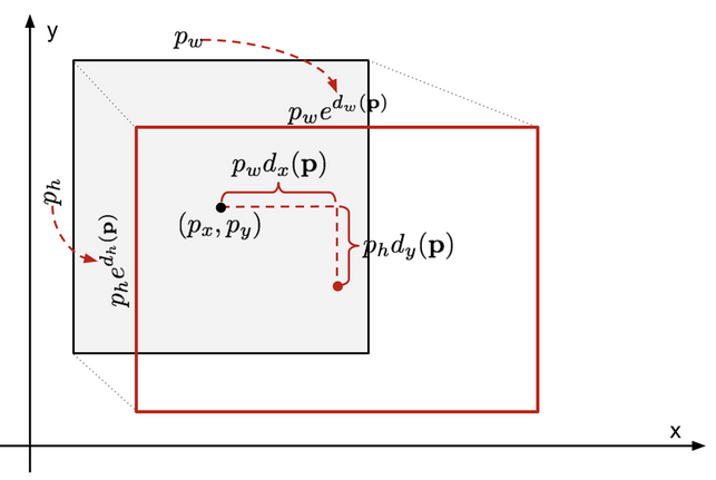 - Note: 这里的逻辑是这样的,\(\textbf{p}=(p_x, p_y, p_w, p_h)\)是目前预测的box,\(\textbf{g}=(g_x, g_y, g_w, g_h)\)是ground-truth box,我们现在想预测出来一个transformation去让预测的靠过去ground-truth。为了使其平移的两项scale-invariant,让放大缩小的两项log-scale,该transformation往那靠的组成方式就设计为了如下公式。