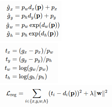 - 而如果就是完美的情况,也就是最后得到的是\(\textbf{g}=({g}_x,{g}_y,{g}_w,{g}_h)\)时,我们能够知道反过去的\(\textbf{d}(\textbf{p}) =(d_x,d_y,d_w,d_h) )\)的值应该为\(\textbf{t}=({t}_x,{t}_y,{t}_w,{t}_h)\),这,也就正是我们想要我们这个输出offset的regressor想要输出的target。于是,最后的loss fucntion 也就是比较我们当前的作为要去往ground-truth靠的d(p)和对于它的“标签”target的L2 loss