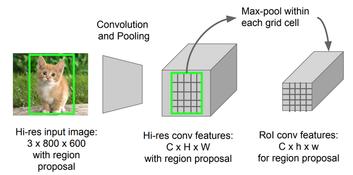 - RoI max pooling works by dividing the h × w RoI window into an H × W grid of sub-windows of approximate size h/H × w/W and then max-pooling the values in each sub-window into the corresponding output grid cell