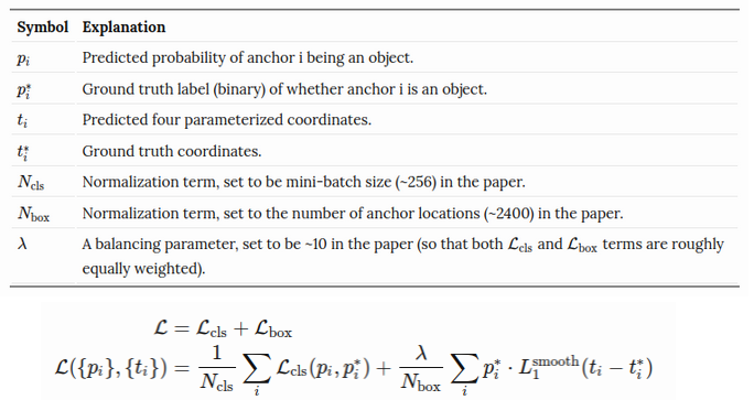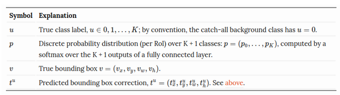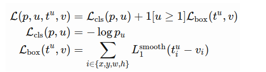- The loss function sums up the cost of classification and bounding box prediction: L=L_cls+L_box. For “background” RoI, L_box is ignored by the indicator function 1[u≥1]: