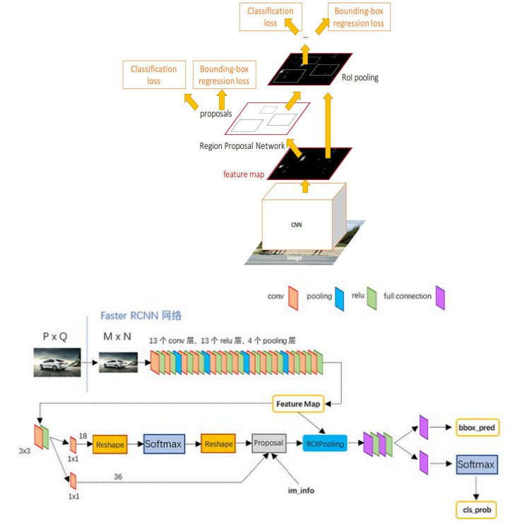 - Faster R-CNN:RPN + 循环式训练 + Fast R-CNN. 再次针对 selective search进行了改进。现在image → cnn → feature map, feature map → rpn → proposals(先单独train,也具有classification和bbox regression但classification只有两类,也就是判断有没有object), feature map + feature map proposals → roi pooling → 正式的Fast R-CNN → feature vector → classification and regression
