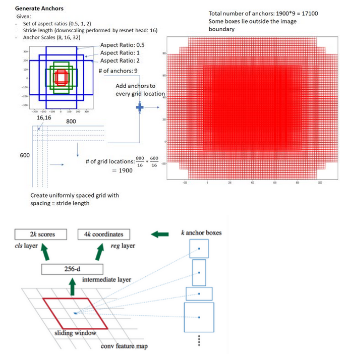 - At the center of each sliding window, we predict multiple regions of various scales and ratios simultaneously. An anchor is a combination of (sliding window center, scale, ratio). For example, 3 scales + 3 ratios => k=9 anchors at each sliding position