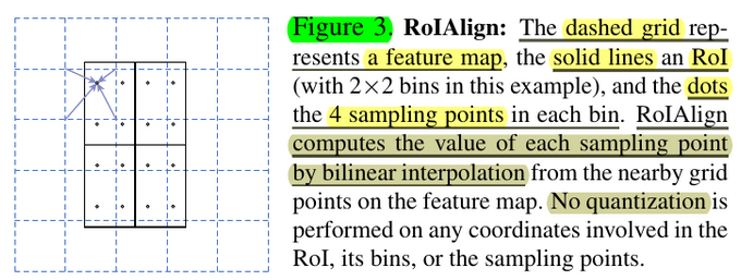 - Our proposed change is simple: we avoid any quantization of the RoI boundaries or bins (i.e., we use x/16 instead of [x/16]). We use bilinear interpolation [22] to compute the exact values of the input features at four regularly sampled locations in each RoI bin, and aggregate the result (using max or average)