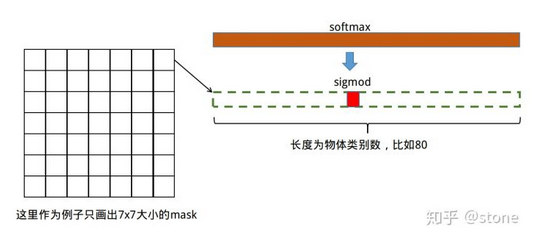 where \(y_{ij}\) is the label of a cell (i, j) in the true mask for the region of size m x m; \(y^k_{ij}\) is the predicted value of the same cell in the mask learned for the ground-truth class k - Note: 假设一共有K个类别,则mask分割分支的输出维度是 mmK, 对于 m*m 中的每个点,都会输出K个二值Mask(每个类别使用sigmoid输出)。需要注意的是,计算loss的时候,并不是每个类别的sigmoid输出都计算二值交叉熵损失,而是该像素属于哪个类,哪个类的sigmoid输出才要计算损失(如图红色方形所示)。并且在测试的时候,我们是通过分类分支预测的类别来选择相应的mask预测。这样,mask预测和分类预测就彻底解耦了