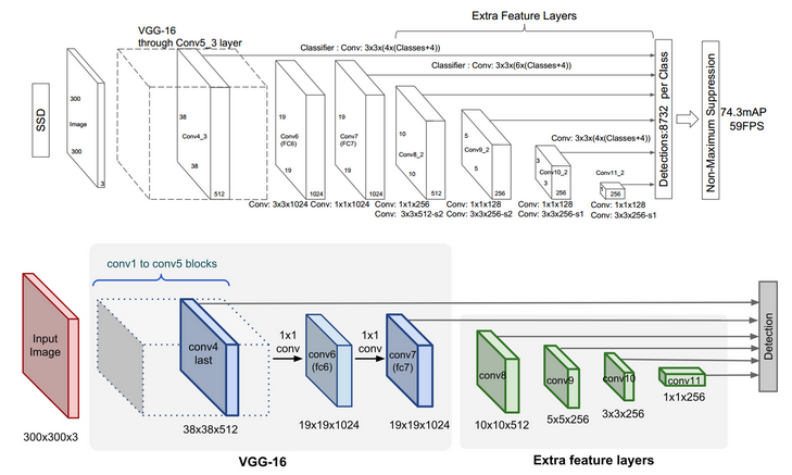 SSD uses the VGG-16 model pre-trained on ImageNet as its base model for extracting useful image features. On top of VGG16, SSD adds several conv feature layers of decreasing sizes. They can be seen as a pyramid representation of images at different scales. Intuitively large fine-grained feature maps at earlier levels are good at capturing small objects and small coarse-grained feature maps can detect large objects well. In SSD, the detection happens in every pyramidal layer, targeting at objects of various sizes.