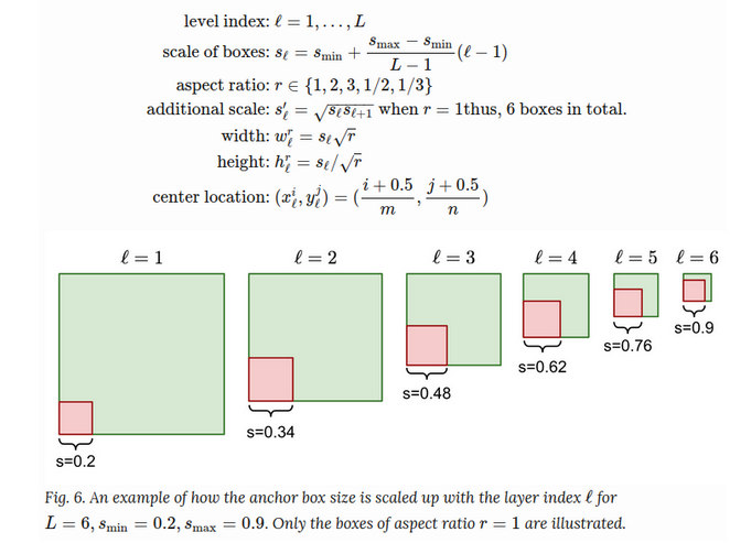 The width, height and the center location of an anchor box are all normalized to be (0, 1). At a location (i,j) of the ℓ-th feature layer of size m×n, i=1,…,n,j=1,…,m, we have a unique linear scale proportional to the layer level and 5 different box aspect ratios (width-to-height ratios), in addition to a special scale (why we need this? the paper didn't explain. maybe just a heuristic trick) when the aspect ratio is 1. This gives us 6 anchor boxes in total per feature cell.