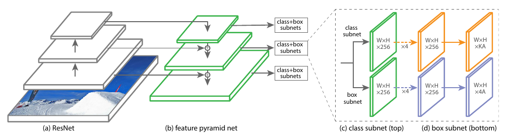 Same as in SSD, detection happens in all pyramid levels by making a prediction out of every merged feature map. Because predictions share the same classifier and the box regressor, they are all formed to have the same channel dimension d=256.