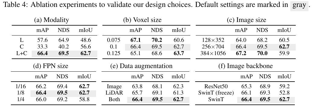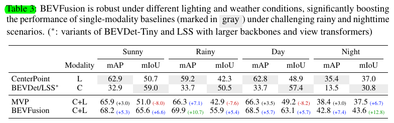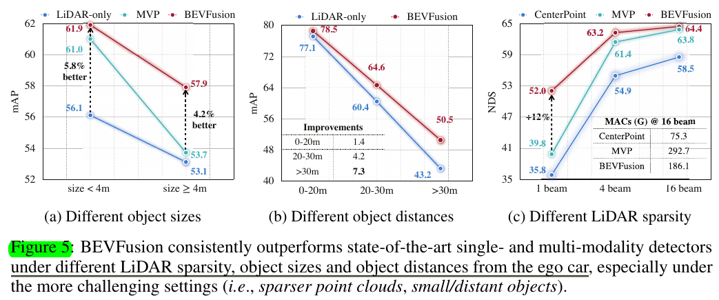 值得注意的是,相比于point-level的fusion,bevfusion在物体size变大了一些的时候依然能够有比较明显的提升