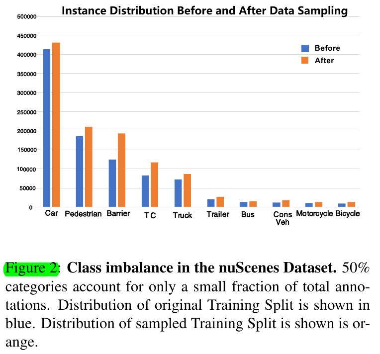 • We propose class-balanced sampling strategy to handle extreme imbalance issue in the nuScenes Dataset.