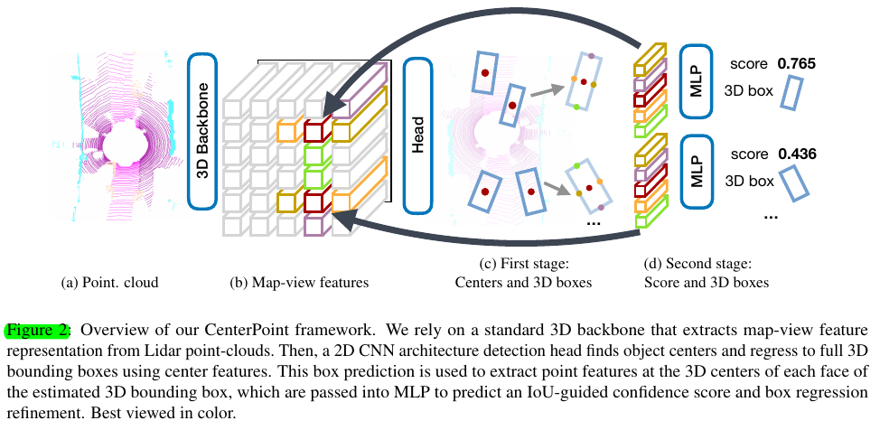 作者还为CenterPoint设计了two stage的方案做refinement. 动机来自于:in autonomous driving, the sensor often only sees the side of the object, but not its center.
