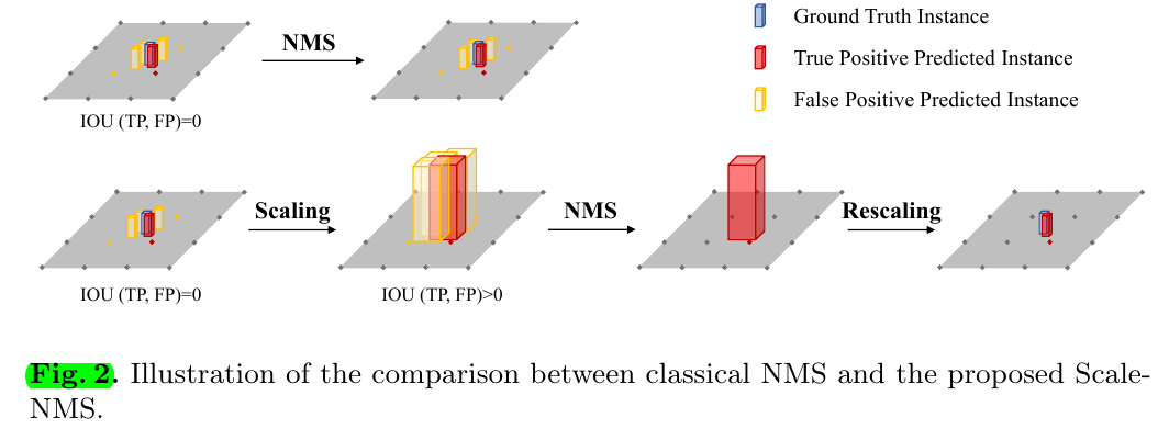 In the BEV space, the occupied areas of various classes are intrinsically different and the overlap between instances should be closed to zero. For example, as illustrated in Fig. 2, objects like pedestrians and traffic cones occupy a small area in the ground plane, which is always smaller than the out- put resolution of the algorithm (e.g., 0.8 meters in CenterPoint [56]). Scale-NMS scales up the size of each object according to its category before performing the classical NMS algorithm. In practice, we apply Scale-NMS to all categories except for the barrier as its size is various. The scaling factors are category-specific.
