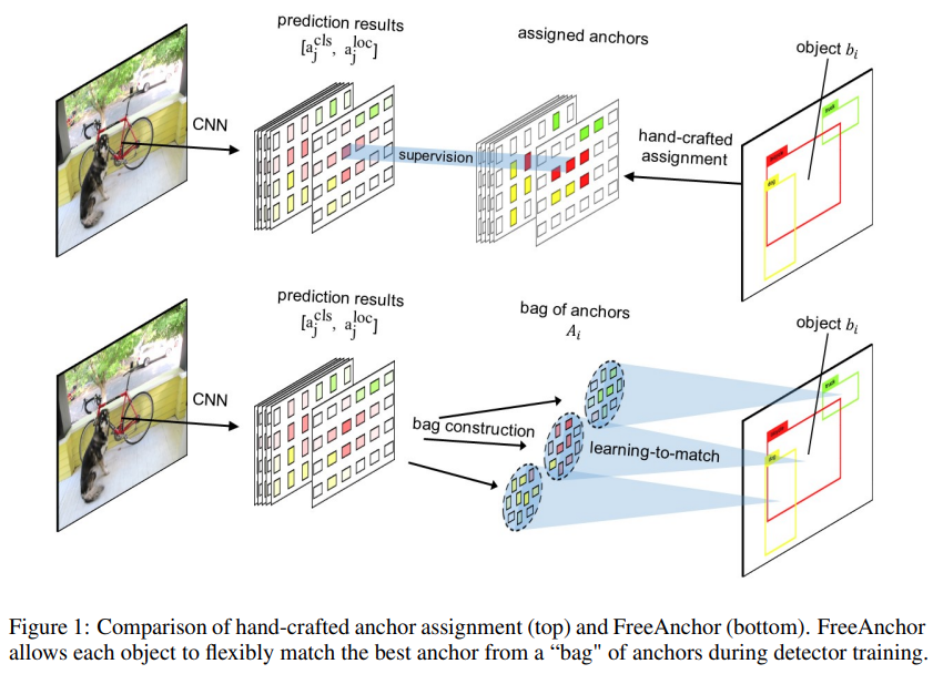 即采用了FreeAnchor文章中的target assignment方法。原文章的motivation在于经典的anchor匹配方法是根据IoU,很硬地匹配到给了grid每个位置上的anchors们,但是对于细长物体或者月牙形物体,包含了很多background内容,直接根据iou显然不合适。所以方法大概是,依然是用iou为每个gt分配到一小部分bag of anchors,然后它们再通过网络预测的形式得到cls和loc,把这两个预测和gt的比对loss给weight到一个式子中,目的是说一个好的anchor应该是cls和loc都很不错才对。我没有去看原文章,仅是通过这里的描述和其它只言片语进行了初步理解,以后如果有时间可以看。下图来自FreeAnchor