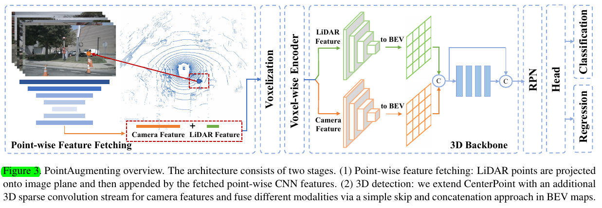 一个point-level fusion的方法,主要有两个点:1. 使用camera feature paint点云,但经过voxel encoding后的3d conv是对于lidar的feature和cat过来的camera feature分别进行的,然后在2d bev后再cat,2. 设计了gt-paste的升级版,对于lidar,采取near-to-far的方式不断过滤点,使得场景合理(原gt-paste的方式为规定不能collision),以及对于camera,采取far-to-near的方式paste图像patch