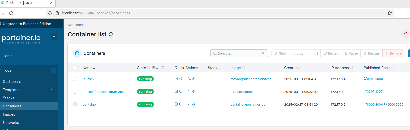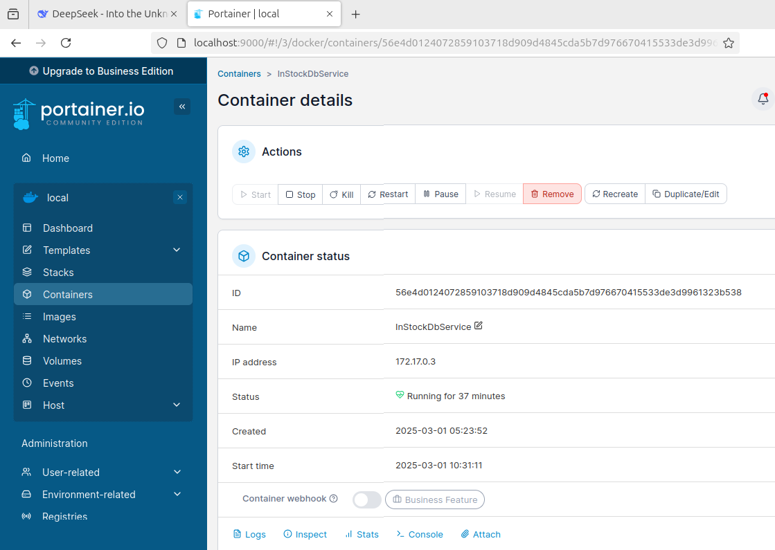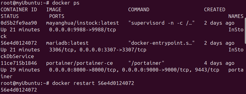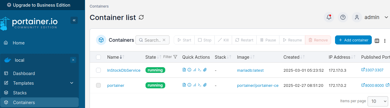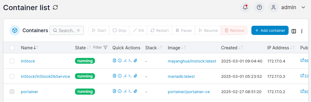 然后在portainer中可以看到InStockDbService容器已经在运行中: