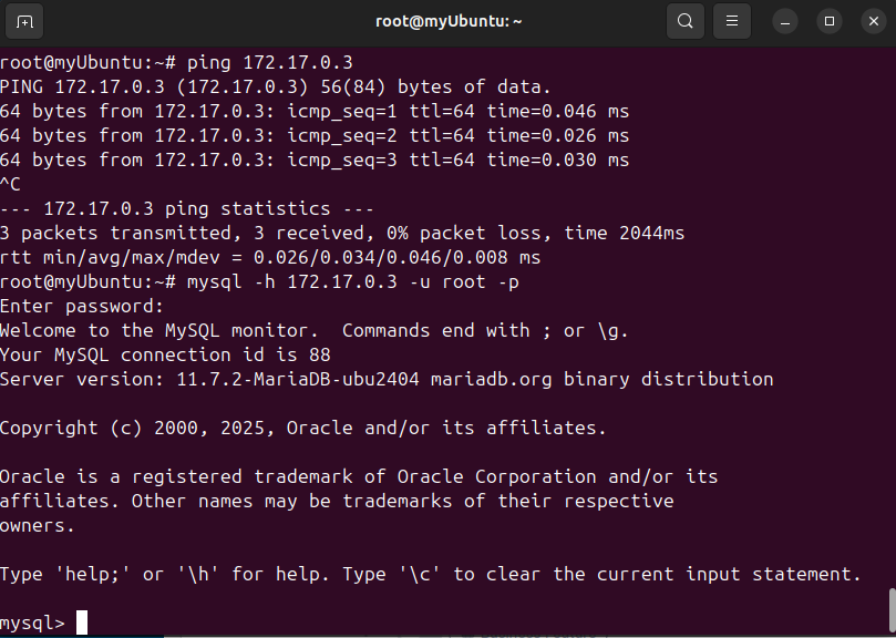 root@f5605d02f9f5:/# mysql -u root -p