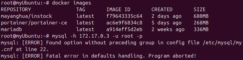 从你给出的错误信息来看,问题并非出在连接 MariaDB 容器这一步,而是本地 MySQL 客户端在读取配置文件 /etc/mysql/my.cnf 时碰到了问题。下面为你详细分析并提供解决办法: