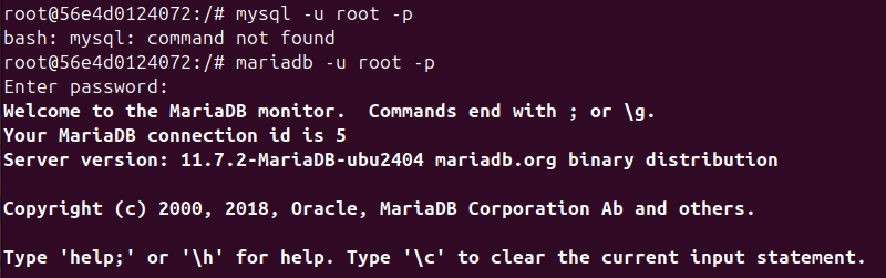 > Welcome to the MariaDB monitor. Commands end with ; or \g.