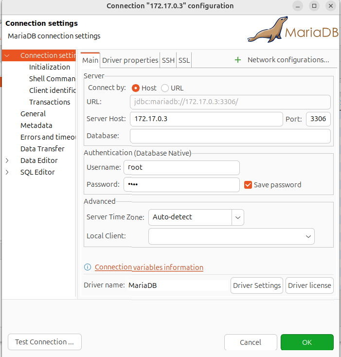 本来是想从windows上访问的,但试了好几次,都不行,可能是因为virtualbox套了Ubuntu, 再装docker再装了mariadb的缘故