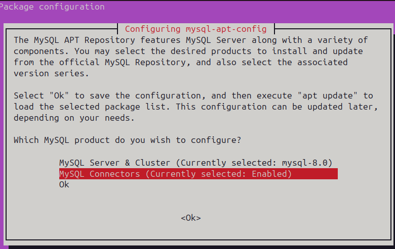 去官网下载mysql.connector:https://dev.mysql.com/downloads/repo/apt/