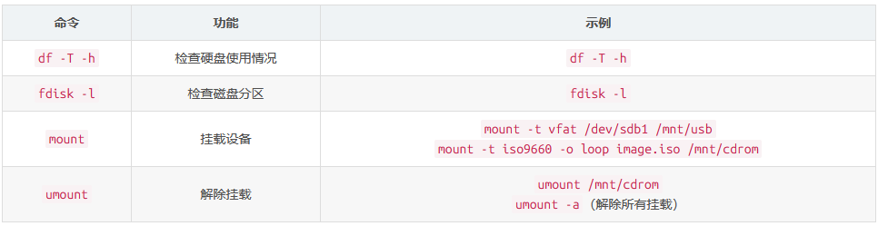 df -h:以人类可读的格式显示磁盘分区的使用情况,包括文件系统、总容量、已用容量、可用容量和挂载点。