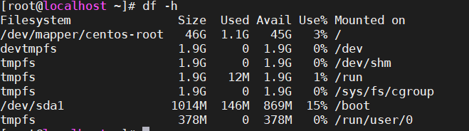 df 命令用于查看已挂载磁盘的容量、使用容量、剩余容量,不加参数以KB单位