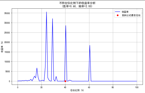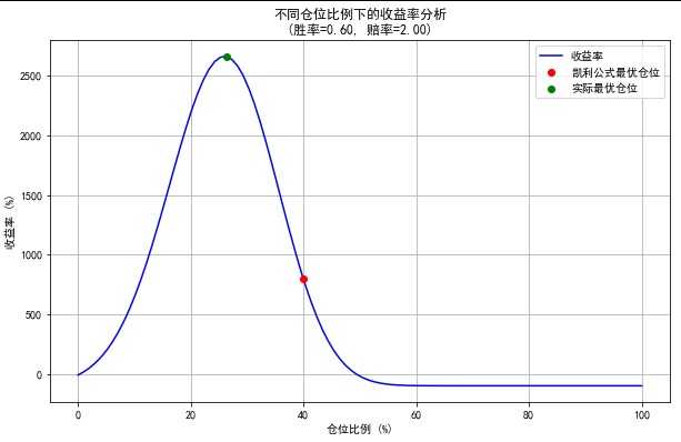 print(f"凯利公式最优仓位比例: {optimal_position * 100:.2f}% (胜率={win_probability:.2f}, 赔率={odds:.2f})")