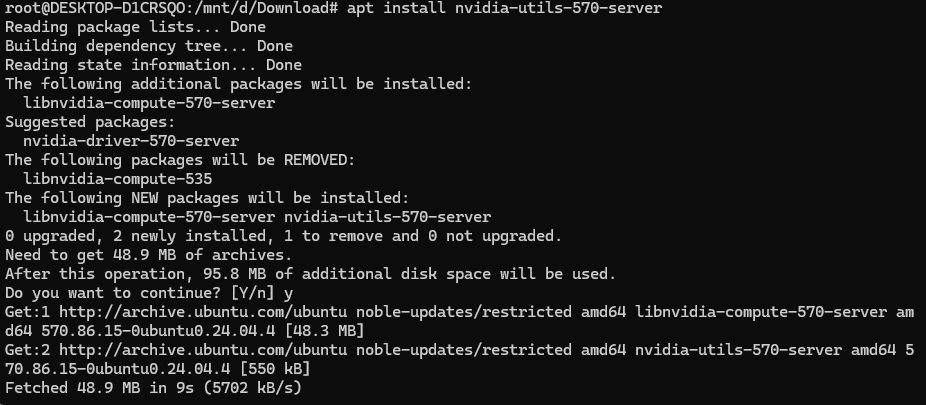 如果不行,我只能按它提示运行:apt install nvidia-utils-570-server (因为这个是最接近我的驱动的那个版本)