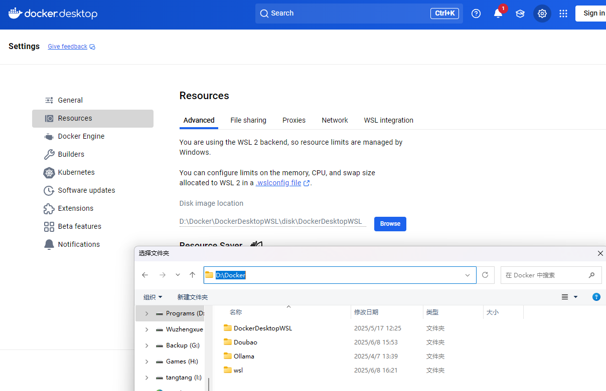 进入Docker Desktop设置页面,Setting -- Resources -- Disk image location, 在这里设置新的文件夹地址,比如: D:/Docker, 然后点右下角Apply & Restart