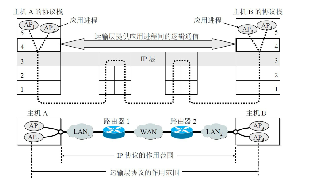 进行通信的实体是在主机中的进程,是这台主机的一个进程和另一台主机的进程在交换数据。因此,两台主机进行通信就是两台主机的应用进程相互通信。虽然IP协议进行分组分发给目的主机,但是这个分组还停留在主机的网络层而没有交付主机中的应用进程。所以常说,端到端的通信就是应用进程之间的通信。