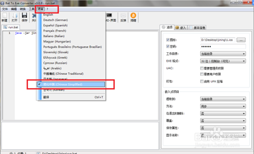 第二步下载安装好之后,打开Bat To Exe Converter,默认是英文的,我们选择语言->简体中文,如下图所示: