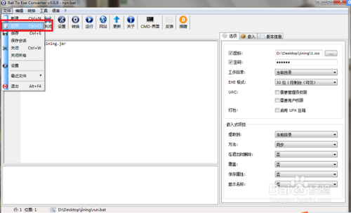 第三步以简体中文显示之后,点击文件->打开,选择要转换成exe程序的bat批处理程序,如下图所示: