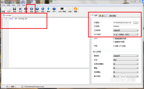 第四步打开bat批处理程序之后,可以看到批处理程序内容,在右侧选项中,选择勾选图标,密码,图标需要原生ico格式的,重命名的不行,密码是打开exe程序需不需要密码,选择好之后,点击上方的转换,如下图所示: