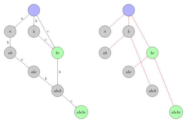 请看左图,根到bc节点其实是有两条路径:->b->c和->c,这两个途径就反映了不同子串的累积方式(胡言乱语)。