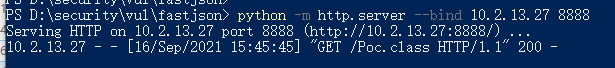 该类为最终触发利用代码的类,因为是通过JAVA RMI方式读取,所以该类需继承UnicastRemoteObject。该对象执行后会在windows环境中弹出计算器。使用javac编译Poc类,生成Poc.class文件。并启用一个简单的Http服务,提供读取Poc.class文件,通过http://10.2.13.27:8888/Poc.class可成功访问到Poc.class文件
