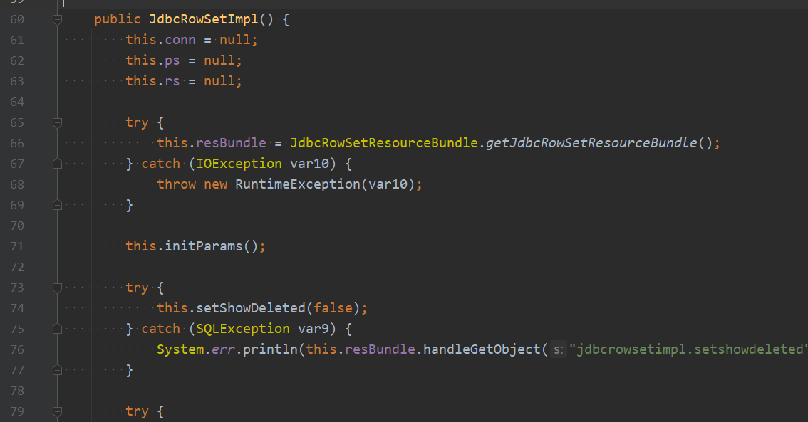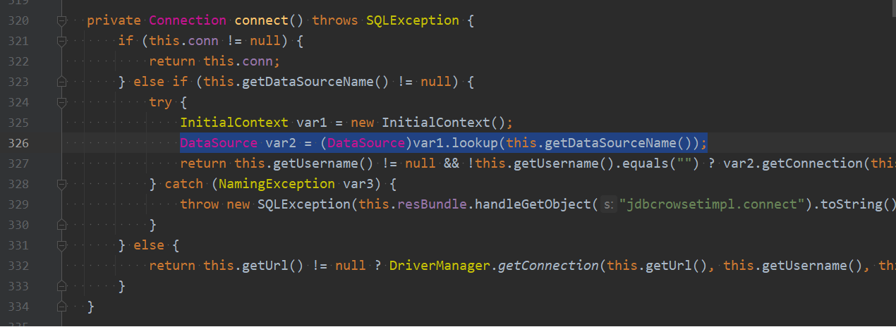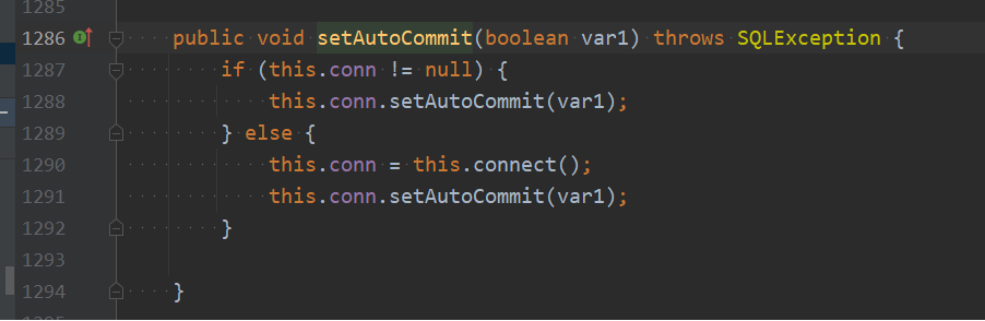 故会直接调用JdbcRowSetImpl类中的无参构造函数进行类初始化。可看到conn设置为null。所以setAutoCommit方法会进入else中,即调用 this.conn = this.connect();