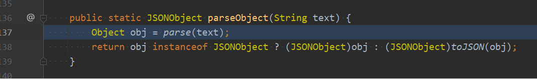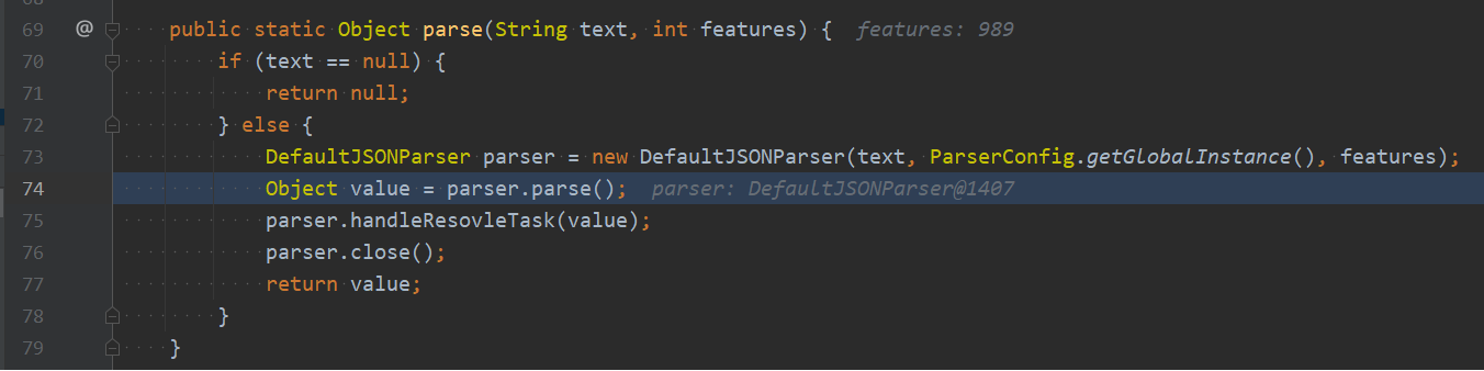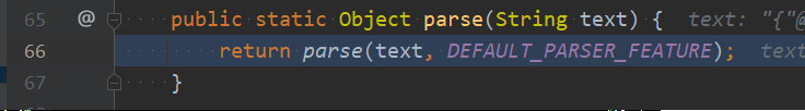 在parse(String text,int features)中调用 DefaultJSONParser parser=new DefaultJSONParser(text,ParserConfig.getGlobalInstance(),features);