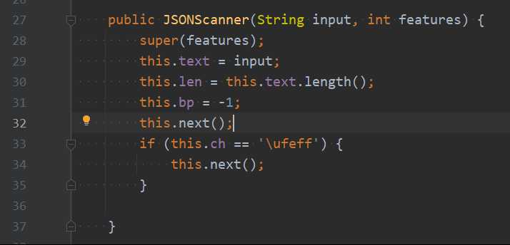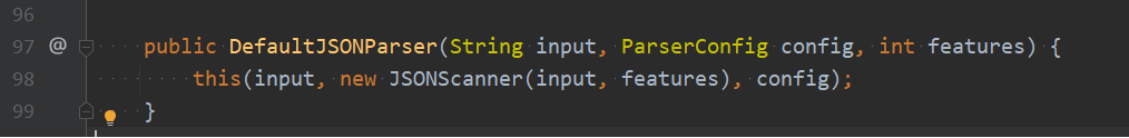 首先初始化了一个DefaultJSONParser的对象,调用的是DefaultJSONParser的三参数构造函数,在DefaultJSONParser构造函数中调用了 new JSONScanner(input,features)