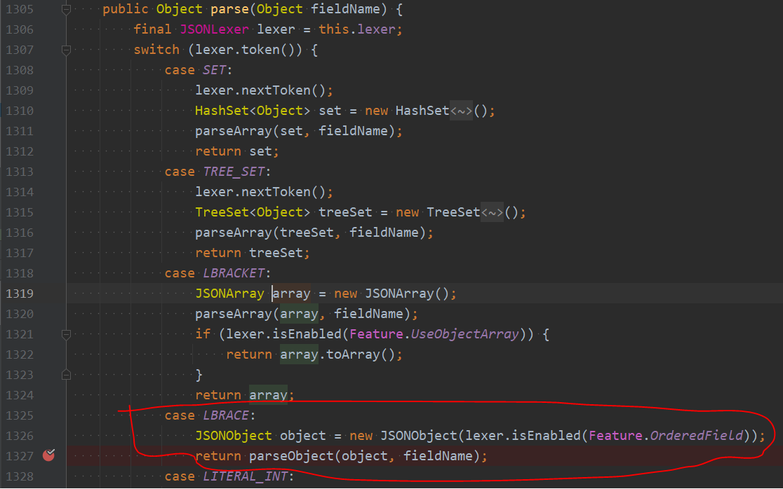 继续进入 parse()--》parse(ObjectfieldName) ,上一步DefaultJSONParse初始化时,token设置成JSONTOKEN.LBRACE