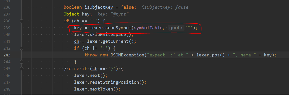 随后进入 parseObject(object,fieldName) ,通过 scanSymbol 获取到 “@type”