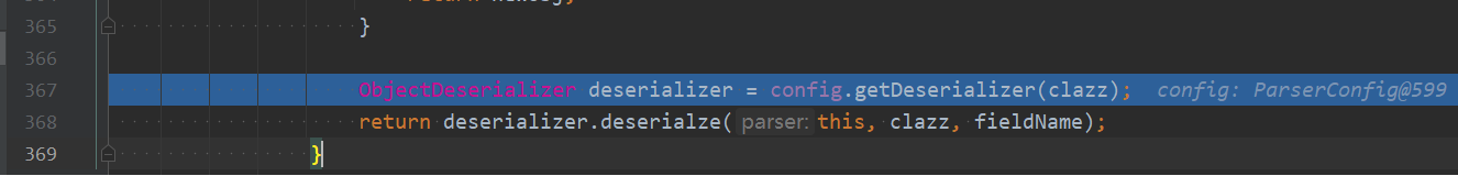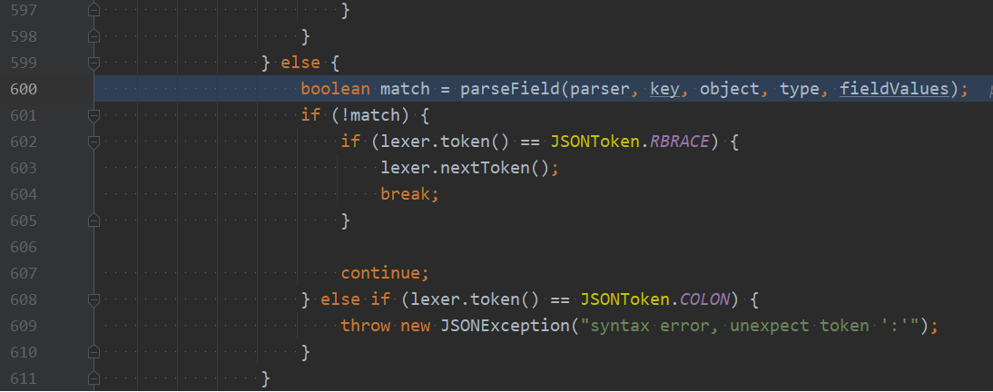进入JavaBeanDeserializer的deserialze方法,并执行到 boolean match = parseField(parser, key, object, type, fieldValues);