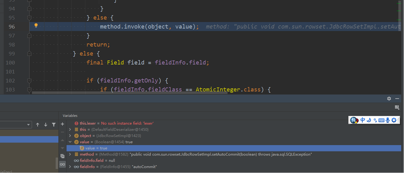 因json中指定了@type参数,故fastjson会尝试将该字符串反序列化为JdbcRowSetImpl类对象,并调用类中的set方法对dataSourceName和autoCommit属性进行赋值。